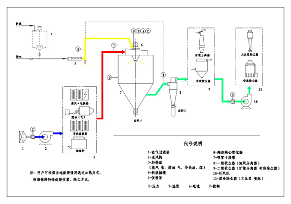 空氣通過過濾器和加熱裝置后,進(jìn)入干燥塔頂部的熱風(fēng)分配裝置,通過此裝置使?jié)崈舻?、熱的空氣均勻的進(jìn)入干燥塔,并呈螺旋狀轉(zhuǎn)動(dòng),同時(shí)將料液送到安置在干燥塔頂中間的離心霧化器中,料液被離心霧化器霧化成霧滴,使料液和熱空氣的接觸面積增加,水分迅速蒸發(fā),在短時(shí)間內(nèi)干燥。再通過之后的除塵設(shè)備等,將干燥好的成品取出。成品連續(xù)的由收料口輸出,廢氣由引風(fēng)機(jī)排空。
